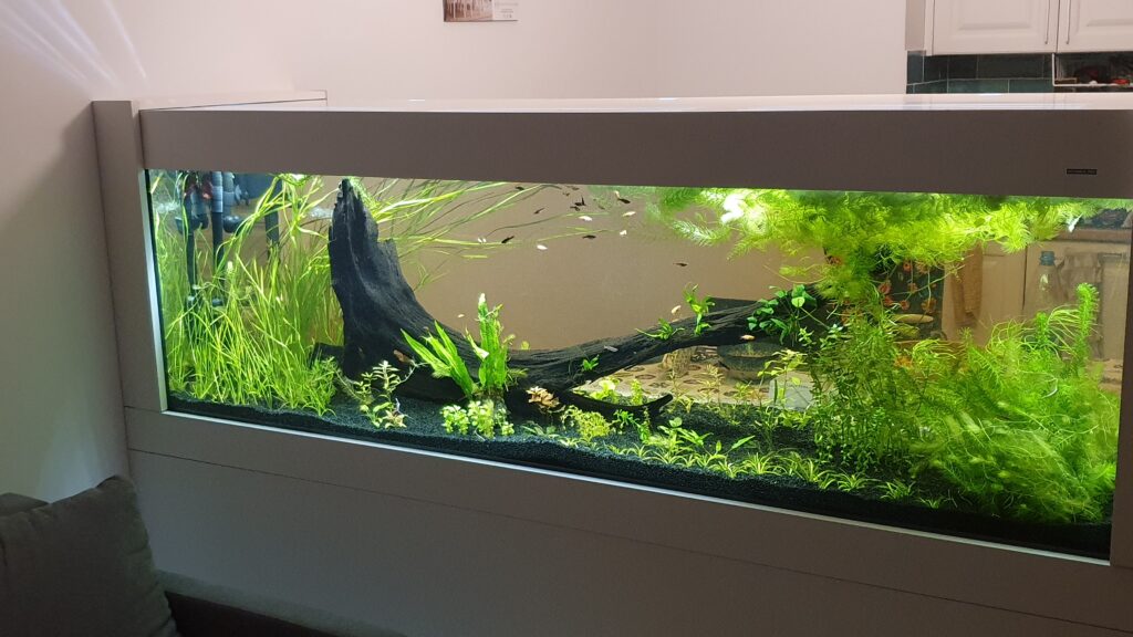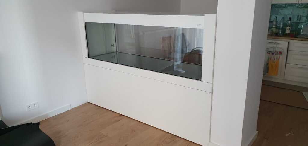 Nowy projekt to akwarium o pojemności 720 litrów brutto, o wymiarach 200 × 60 × 60 cm. Zbiornik jest nietypowy, bo można go oglądać z dwóch stron – stoi pomiędzy aneksem kuchennym a częścią wypoczynkową (nie nazwałbym jej salonem 😉).